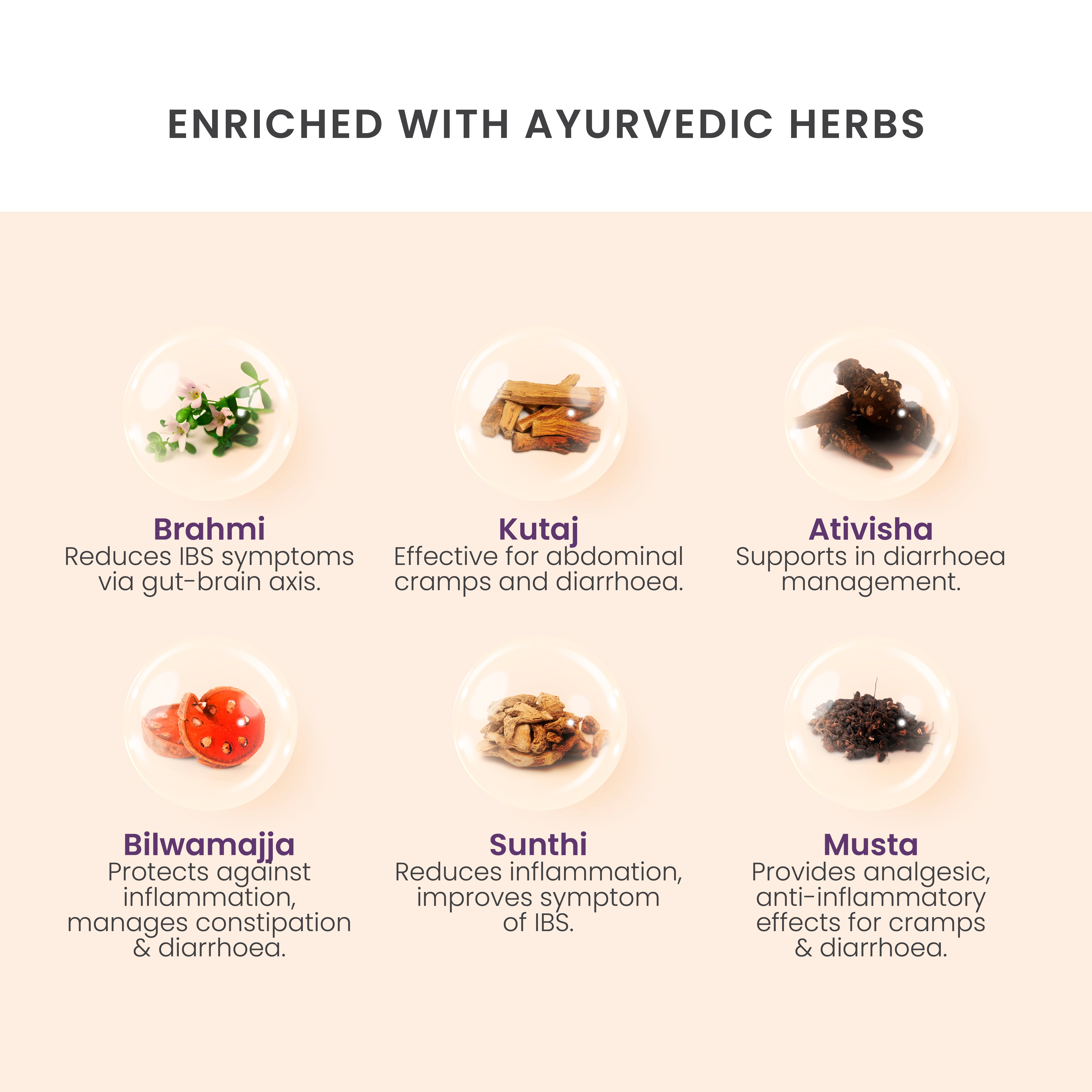 4. Supports IBS-D & IBS-M Types: Regulates gut–brain signaling to reduce urgency, flare-ups, and stress-linked digestive disturbances. Powered by Sunthi, Kutaj, Bilwamajja, Brahmi, and Musta — a clinically proven Ayurvedic blend for sustainable gut health.