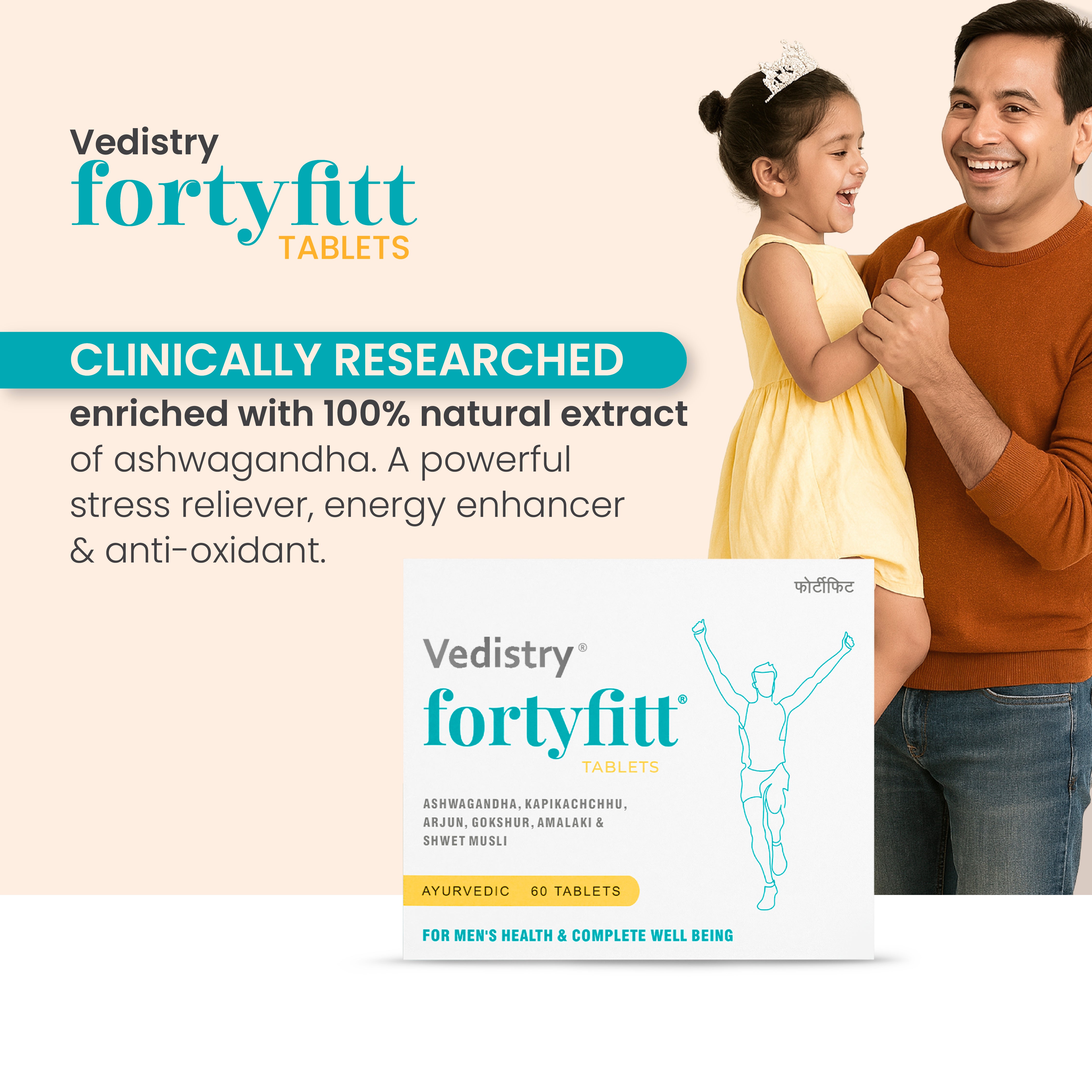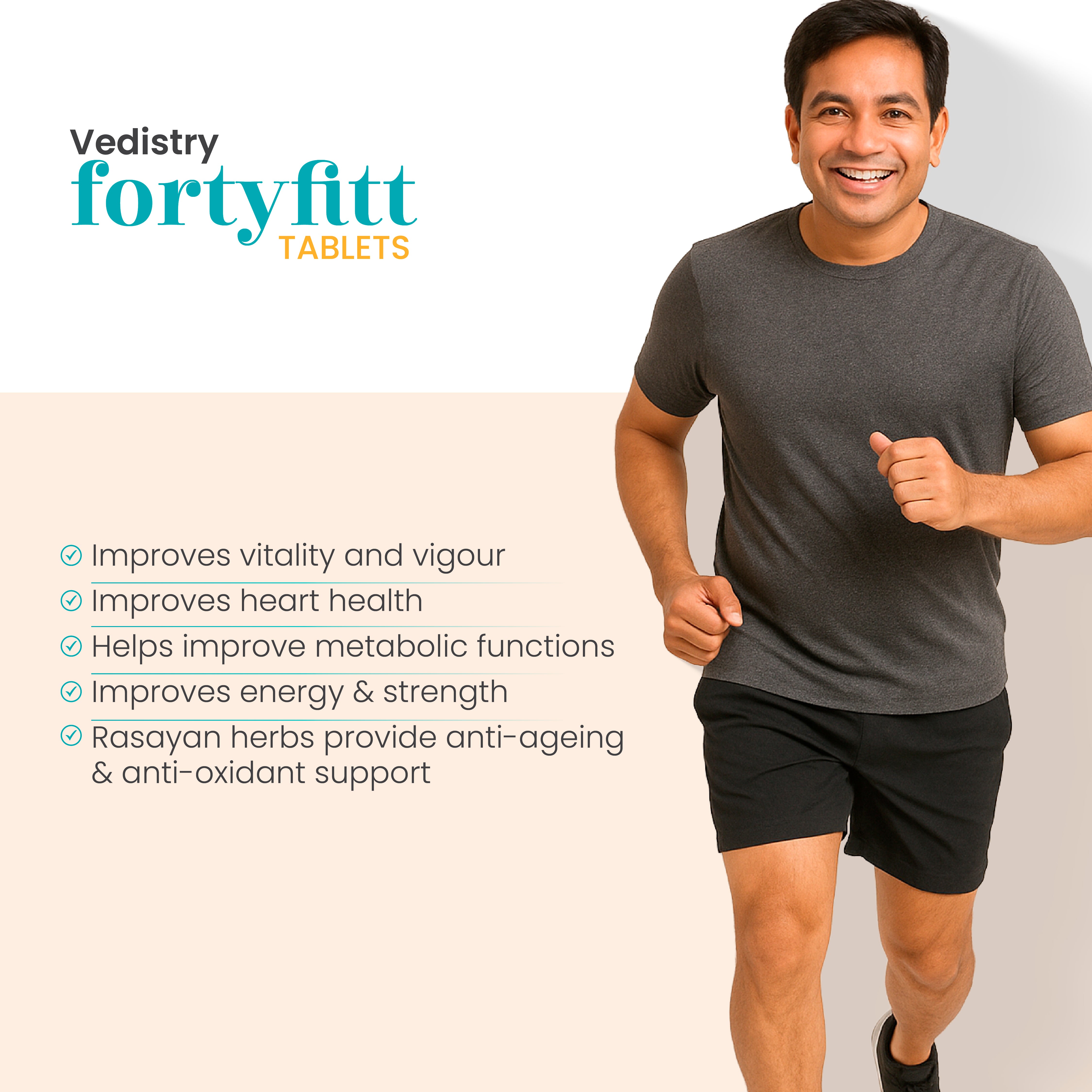 Forty Fit Men is an Ayurvedic-inspired supplement designed to support men over 40 by maintaining hormonal balance, improving energy, supporting bone and muscle health, and promoting overall vitality.