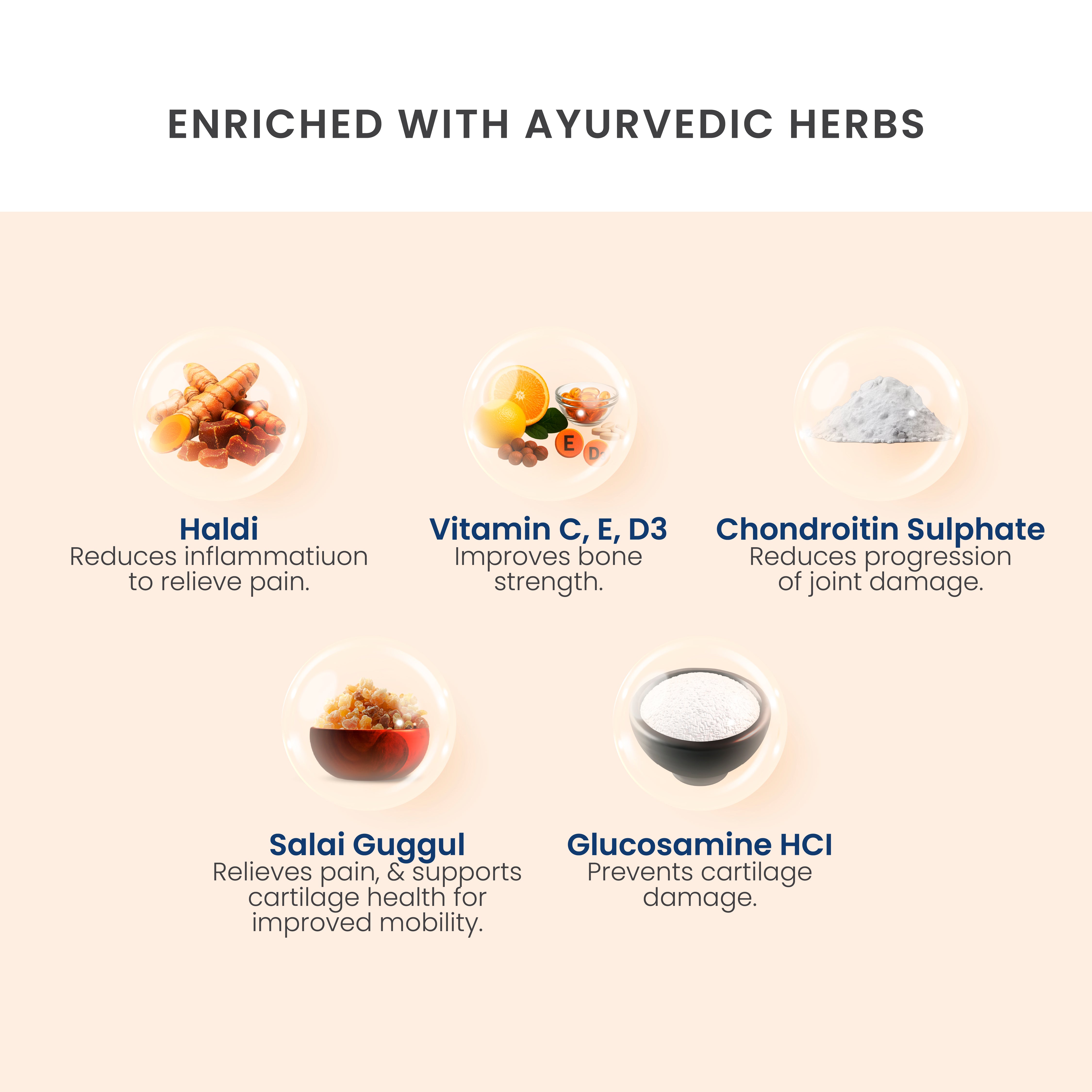 - Powerful combination of Ayurveda and Nutra : This formula combines Ayurvedic herbs with Glucosamine, Chondroitin, Calcium, and Vitamin D3 — essential nutrients for bone and cartilage repair. Together, they help regenerate cartilage health, promote joint lubrication, boost bone density, and improve mobility.