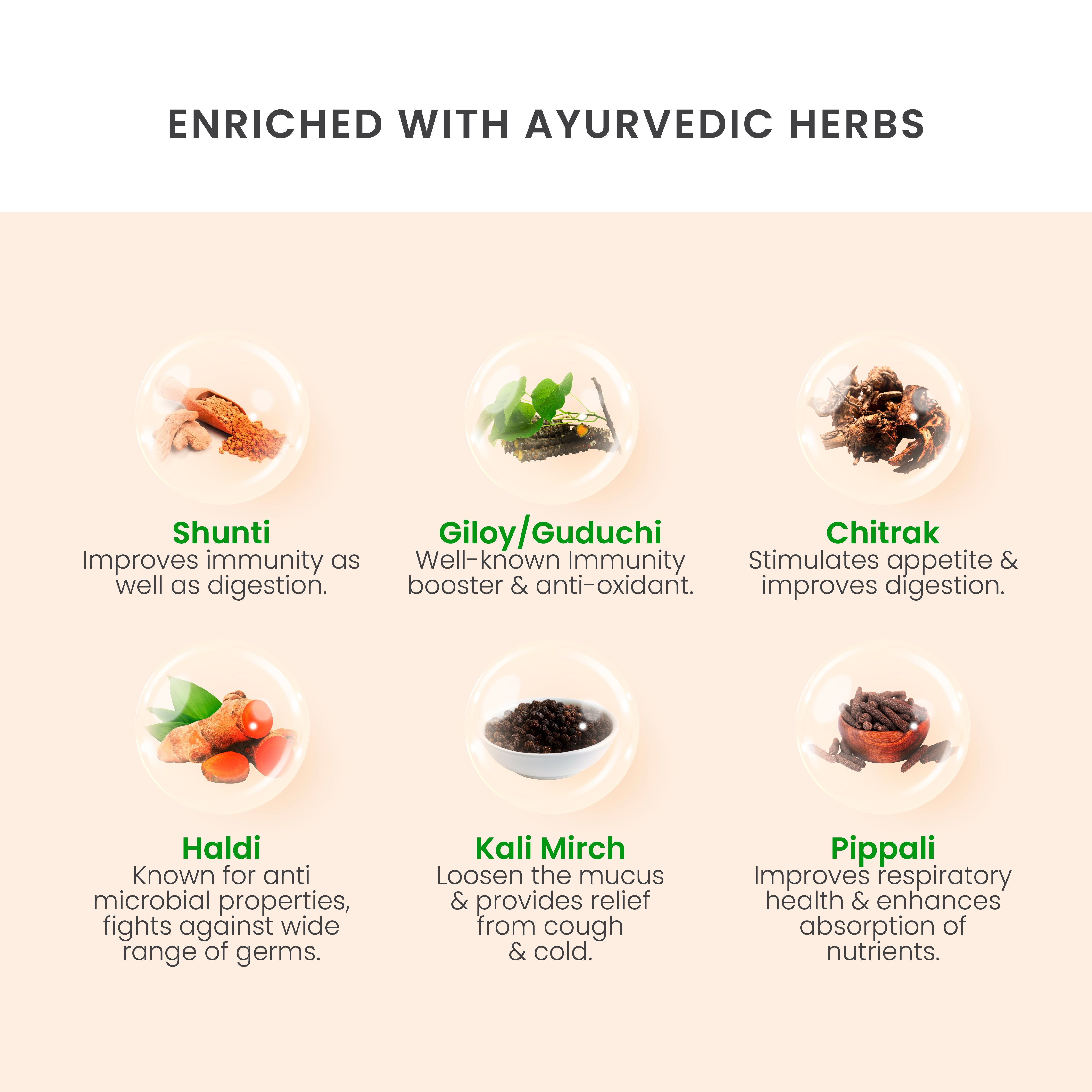 3. 100% Ayurvedic: Enriched with herbs like Giloy (antioxidant & immunity booster), Haldi (antimicrobial), Pippali (supports nutrient absorption), Chitrak (digestion & metabolism enhancer), Kali Mirch (mucus relief), and Shunthi (immune & digestive aid),